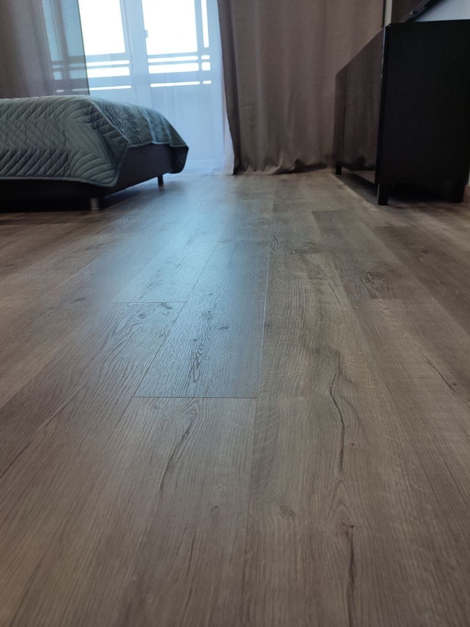Кварцевый ламинат очень отличного качества, приятно ходить, не продавливается мебелью, . КРАСИВАЯ ЦВЕТОВАЯ ГАММА НА ВЫБОР. Не видно стыков.
