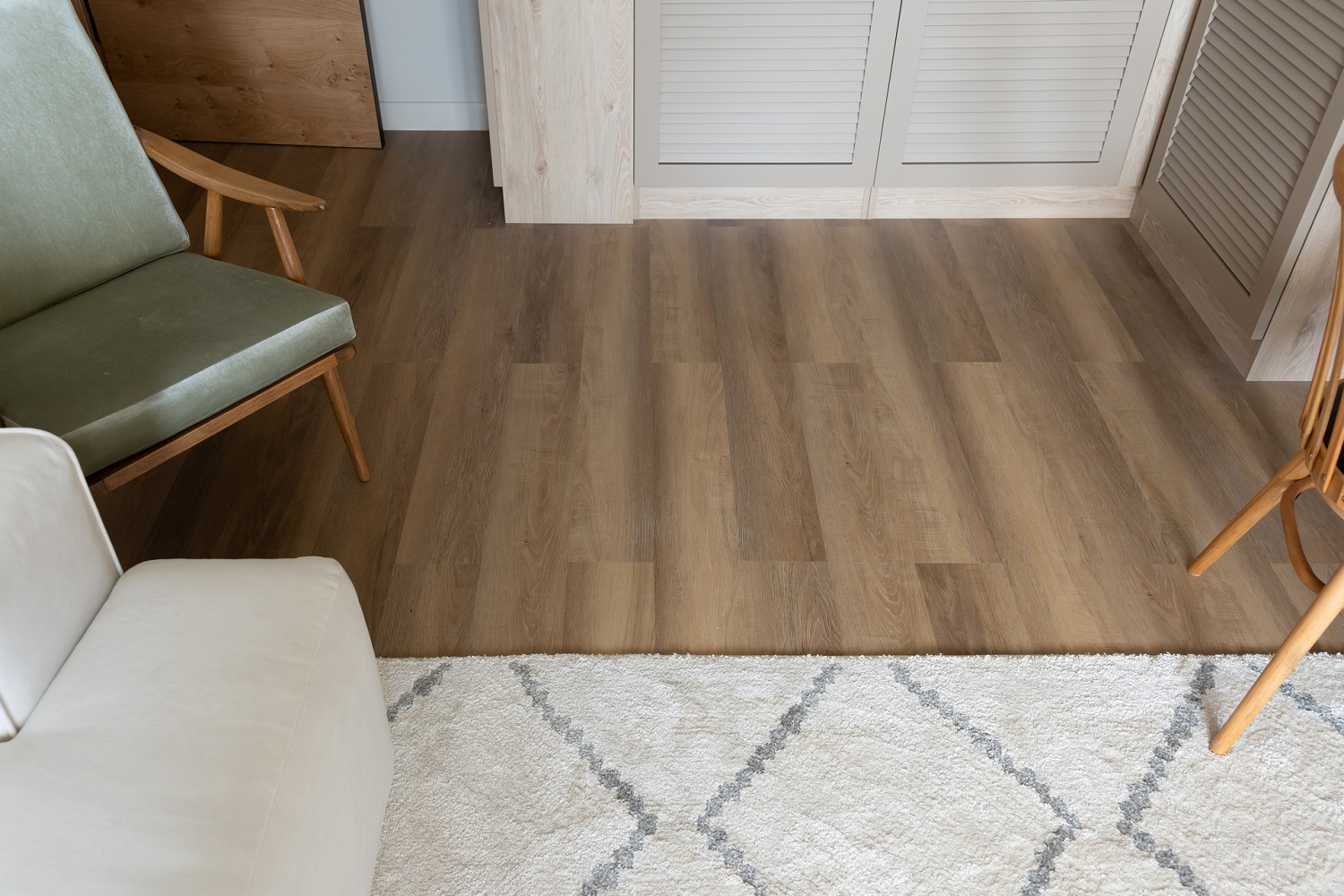 Кварцевый ламинат Fargo Comfort Дуб Мехико 70W921 легко вписывается в любой интерьер и обладает высокой износостойкостью, поэтому на полу уложили именно его.